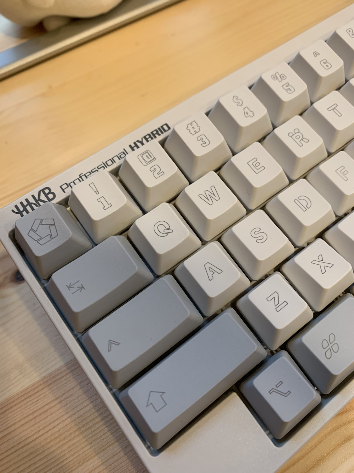 相棒のキーボードである、自分でデザインした世界に1つしかないキーキャップのHHKBです。