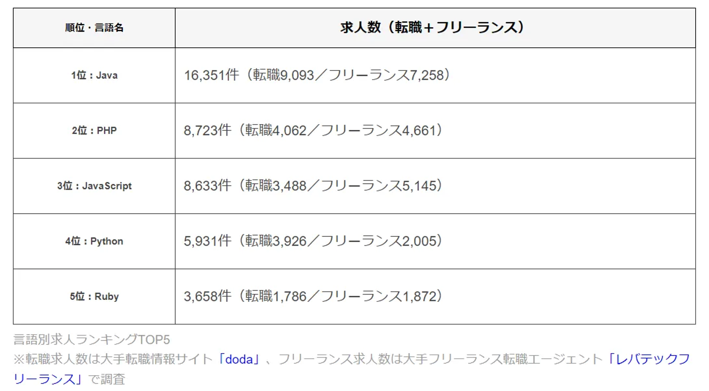 人工知能(AI)開発でPythonも今人気な言語ですが、Javaと比較するとやはり案件数は断トツでJavaが多い傾向です。