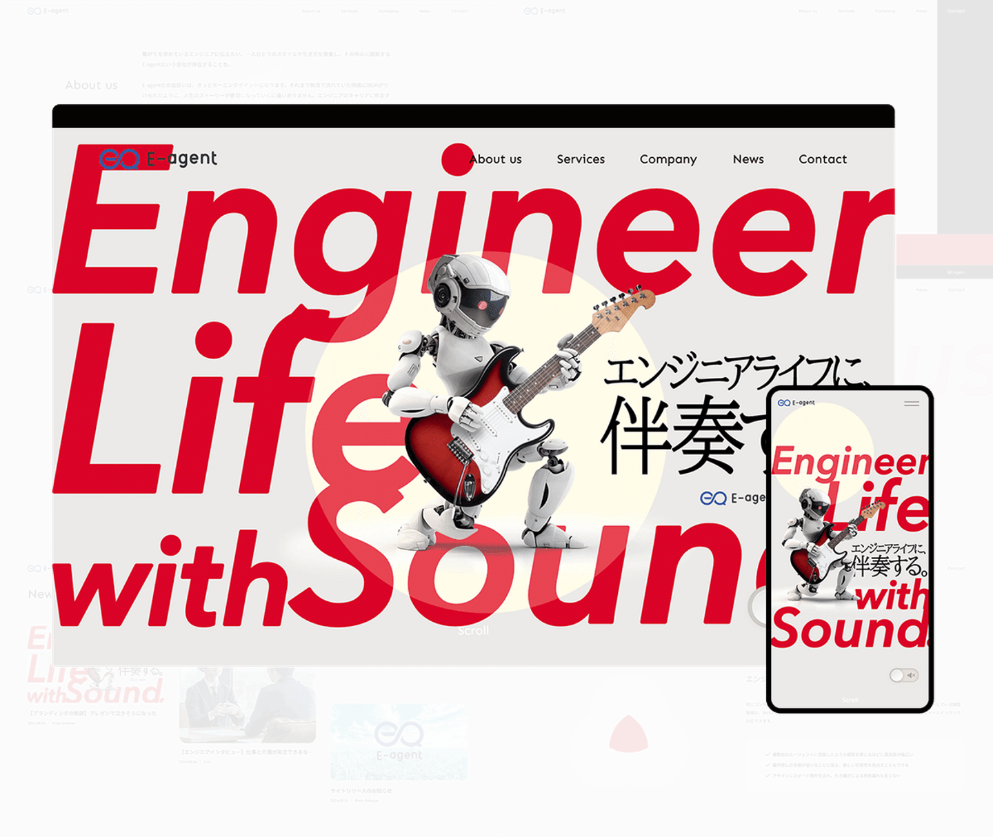 クリエイティブアワード最優秀賞を受賞したのは、デザイナーチーム(山田・古屋)が担当したIT企業のコーポレートサイトブランディング事例。代表がギタリストというユニークな特長を活かし、「エンジニアライフに、伴奏する。」というコンセプトを策定し、ロボットがロックミュージシャンのように演奏するデザインをディレクションしました。