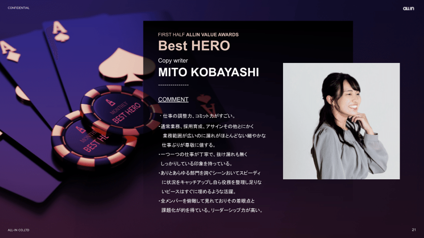 私は堅実なリアリストなので、漠然とした夢や目標を描くのが苦手なんです。でも、「派手で目立つすごい人」にはなれなくても、少しずつ手の届く範囲を広げていけば、「いたら安心・信頼できる人」になれるかもしれない。そのように考える私にとって、Stay Low Key(控えめに、そして気高く)というALL-INのバリューはかなり胸に刺さりました。自分から仕事を生み出す・動かす・先回りすることで、できる仕事を増やしていきたいです。
