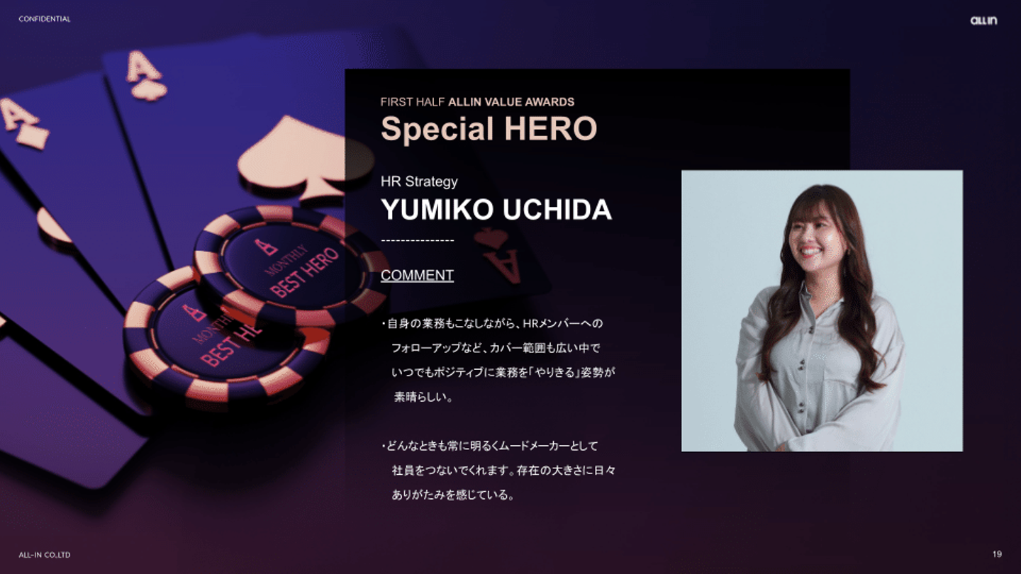 - 自身の業務もこなしながら、HRメンバーへのフォローアップなど、カバー範囲も広い中で、いつでもポジティブに業務を「やりきる」姿勢が素晴らしい。