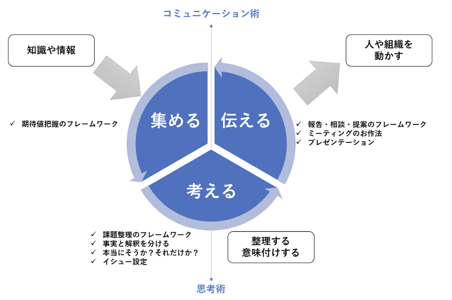 藤井:まずは、PS研修で扱うべきテーマを検討しました。書籍等で紹介されるフレームワークを活用する「理論」面と、メンバーからのヒアリングで得られる「現場の声」、両方向に目を向けながら策定していきました。結果、思考術とコミュニケーション術を養ってもらえるような枠組みとなりました。