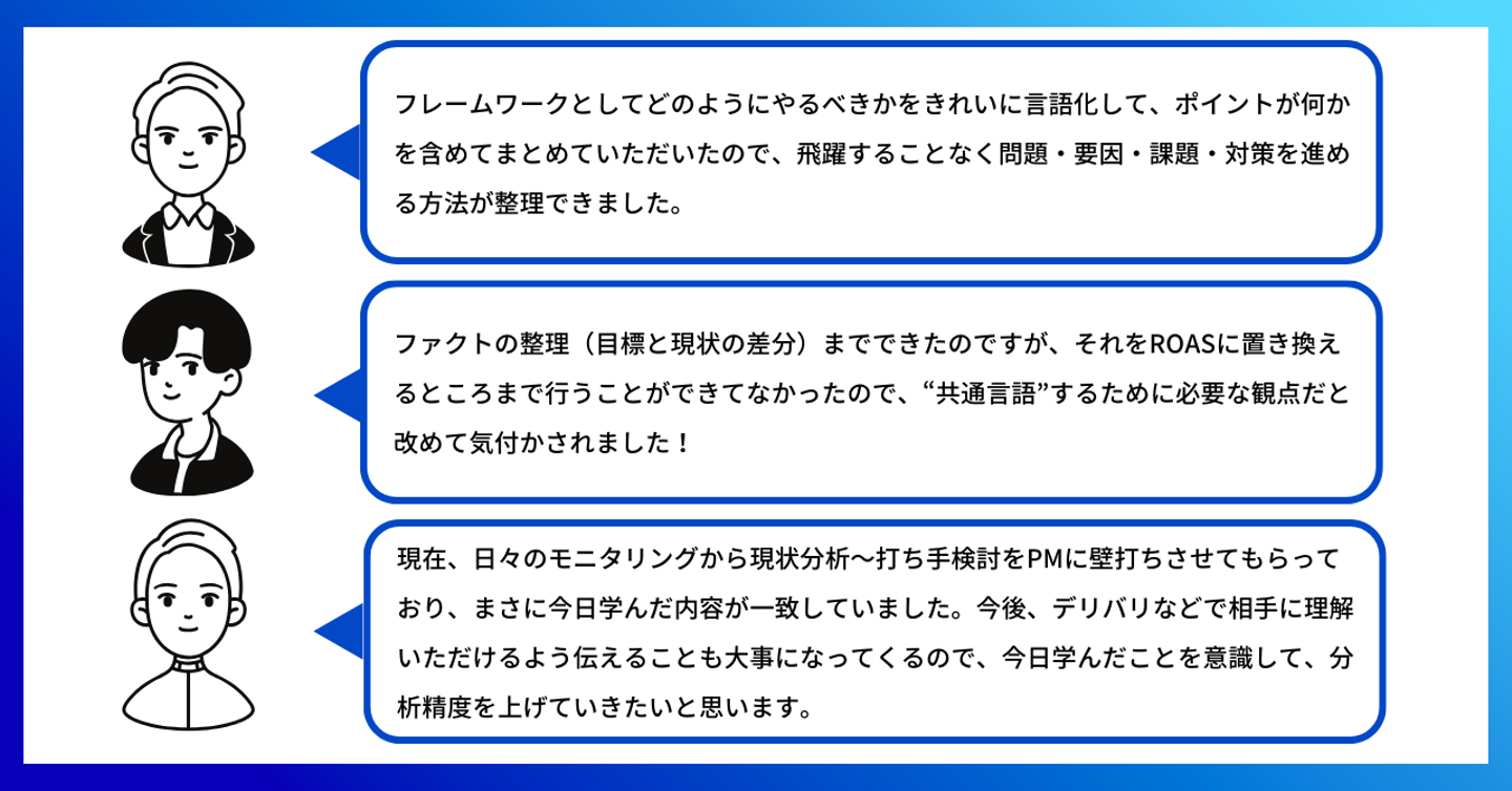 藤井:まさに準備中なのですが、PS研修の応用編となる「数値分析研修」をローンチしようと思っています。今回お話ししたPS研修は汎用性を重視したものでしたが、より具体的な広告運用、リスティングやディスプレイ広告の分析をするとなった時に「どのようなアウトプットを出すのか」を学べるコンテンツを作っているところです。