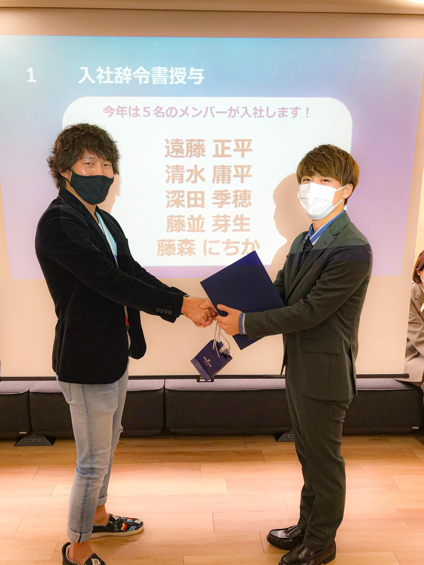 続いて、代表の岩城から新卒社員一人ひとりに入社辞令と記念品の授与が行われました。