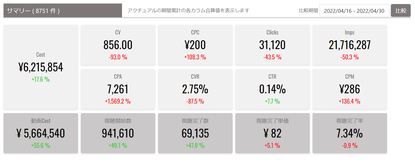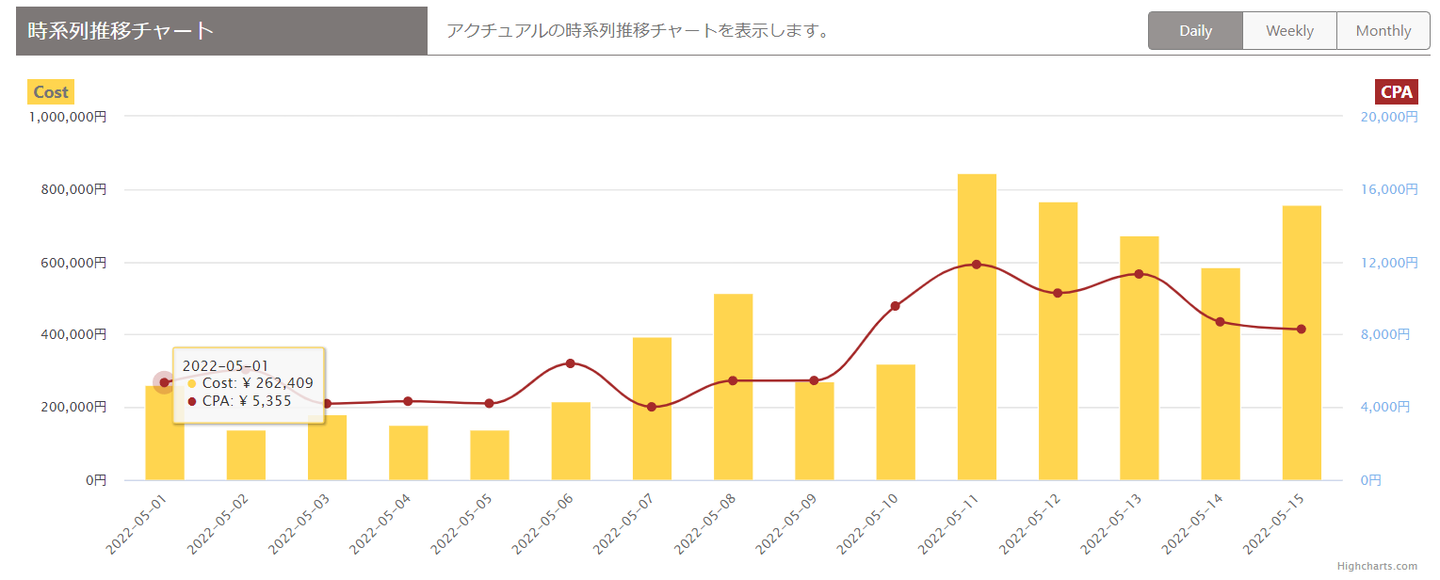時系列、媒体別、クリエイティブ別でのアクチュアルパフォーマンスを可視化します。