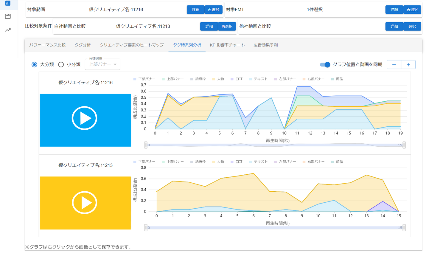 AIが広告動画内の構成要素(人物、ロゴ、商品、テキスト等)を自動検出し定量化することで、KPI、タイムライン(動画尺)、広告効果予測等の分析結果をもとに、他のクリエイティブとの比較も可能となり、クリエイティブPDCAの効率化を実現していきます。