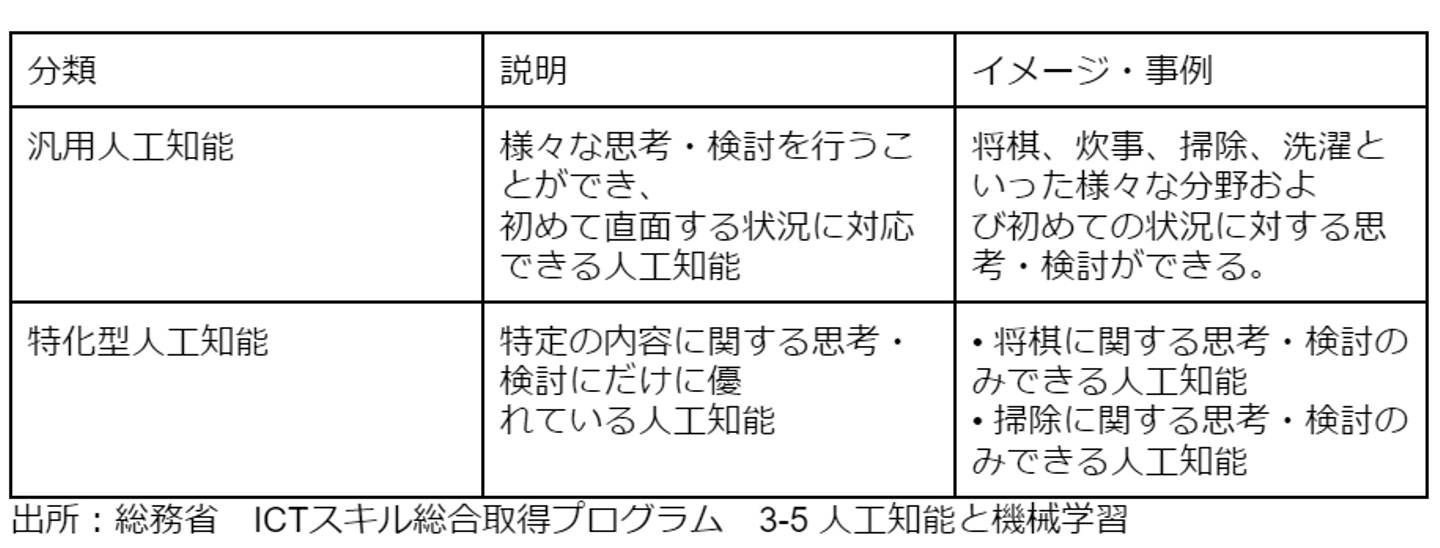 AIは下表のように、汎用人工知能と特化型人工知能に大別されます。