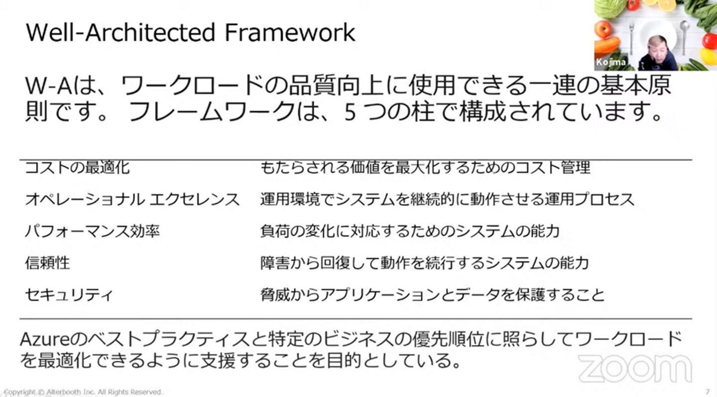 なので、Azureのベストプラクティスと特定ビジネスの優先順位を照らして、ワークロードを最適化できるように支援することを目的としています。