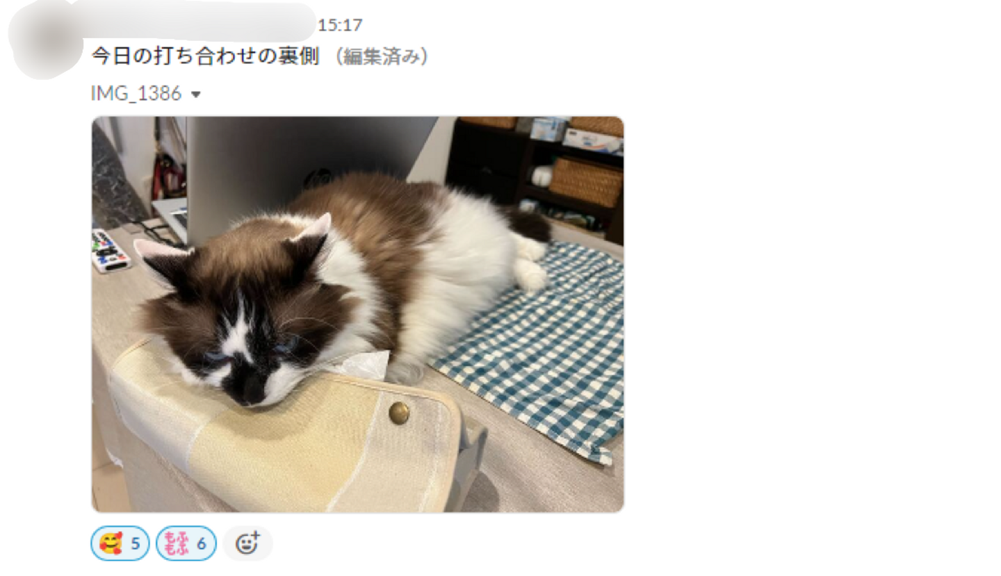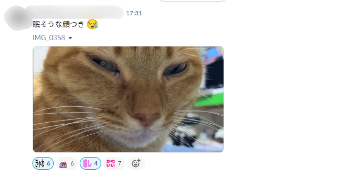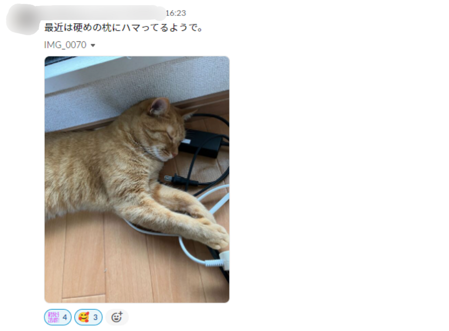 写真が投稿されるとスタンプ(emoji)でのリアクションも続々と。リモート勤務の傍らで、社員の日常や癒されっぷりが伝わってきます。