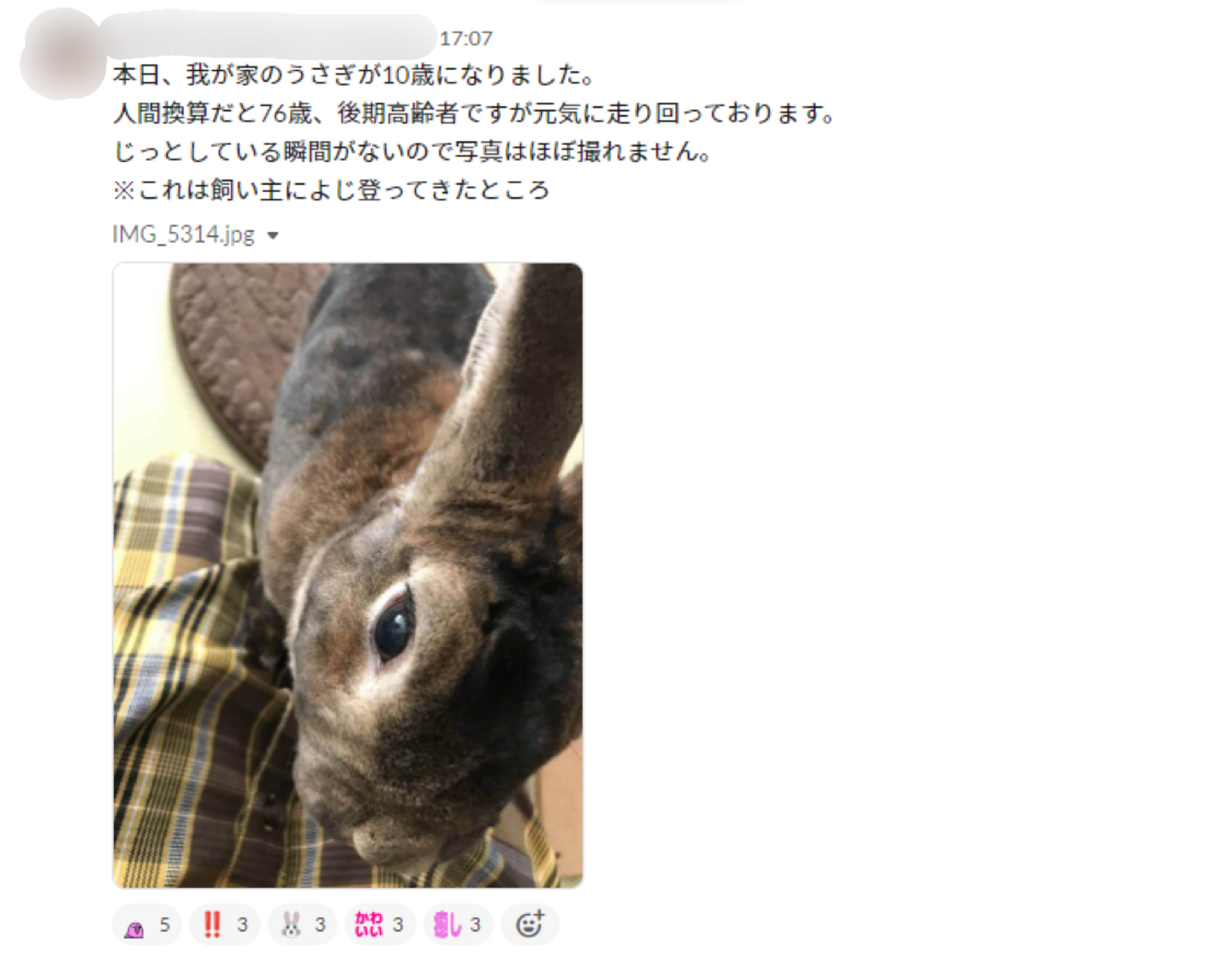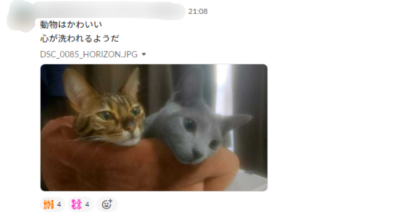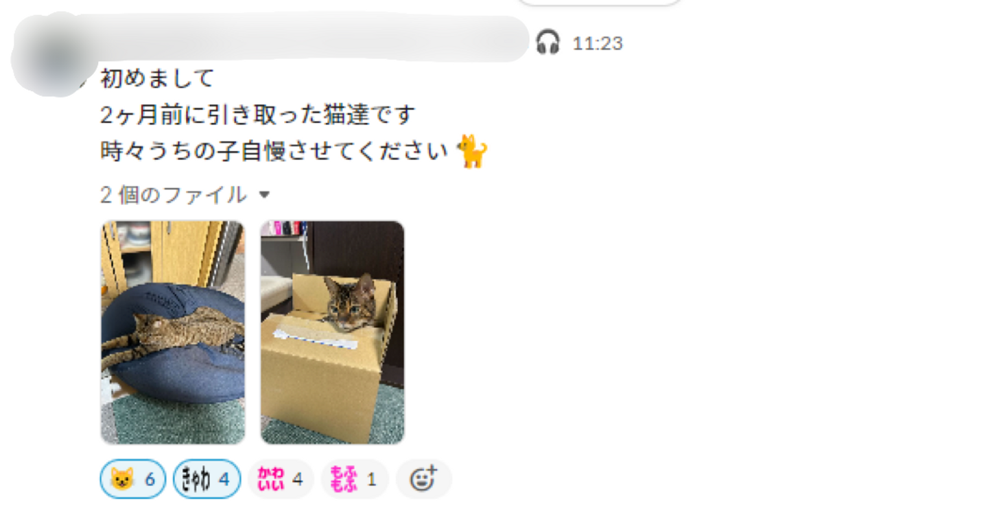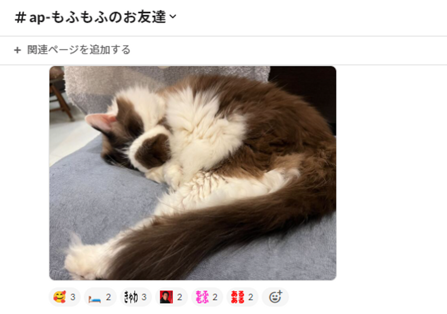 写真が投稿されるとスタンプ(emoji)でのリアクションも続々と。リモート勤務の傍らで、社員の日常や癒されっぷりが伝わってきます。