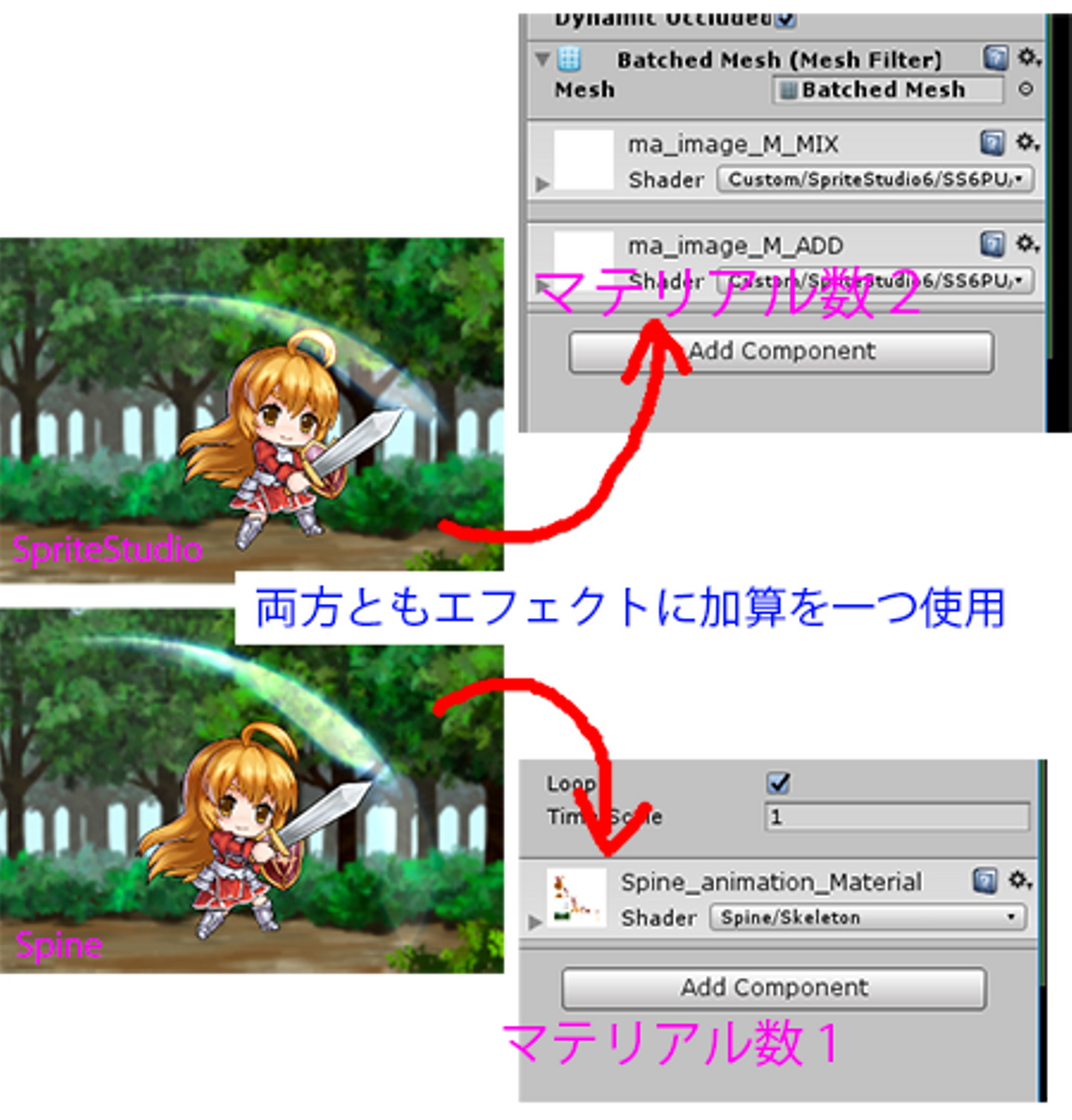 この差について、SpriteStudioのデータをK氏が確認したところ描画モード(加算や乗算等)を増やすとSpriteStudioの場合は追加する分だけマテリアルが増えるという状態を確認。これがBatches数、SetPass calls数のカウントになるようで、上記のサンプル結果は剣の軌跡エフェクトに加算を入れていた為の差でした。