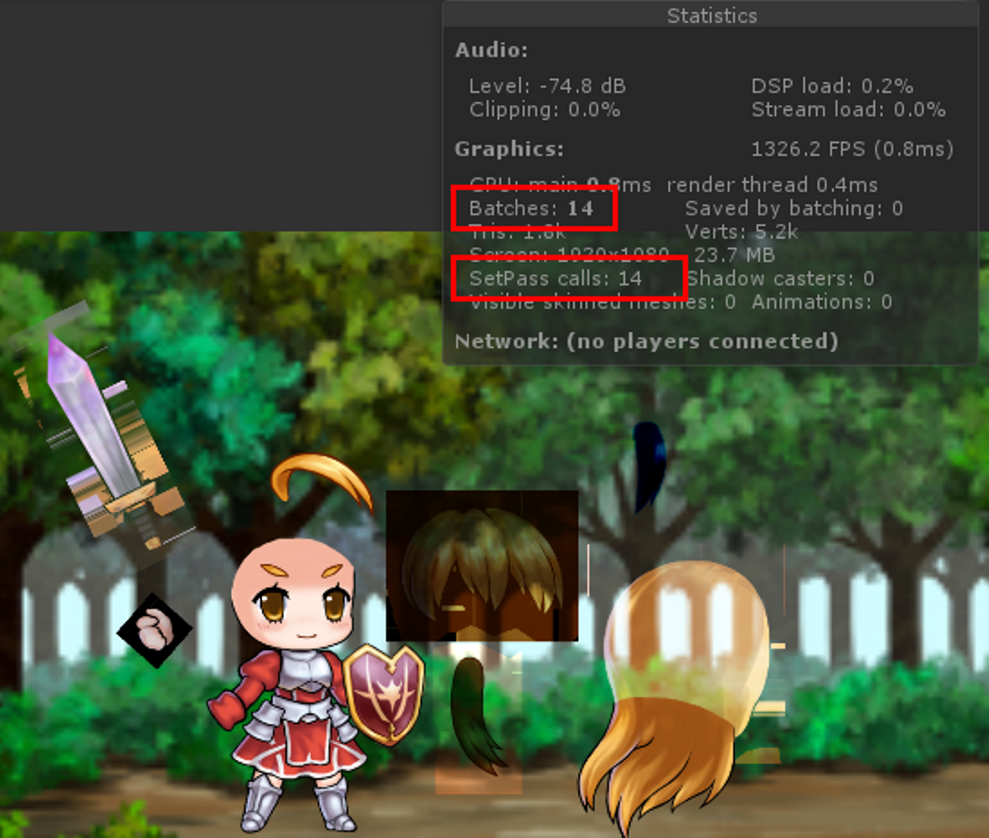 ちなみに無理やり描画モードを追加した状態が以下の画像です。Batches、SetPass callsが大幅に増えているのが見て取れます。実パフォーマンス優先で、UnityのSpriteへの変換機能(Unity-Nativeモード)の利用を考えても良いかも知れません。(Unity側のバッチングに任せることでBatches数は増えますが、その分高速に表示できるそうです)