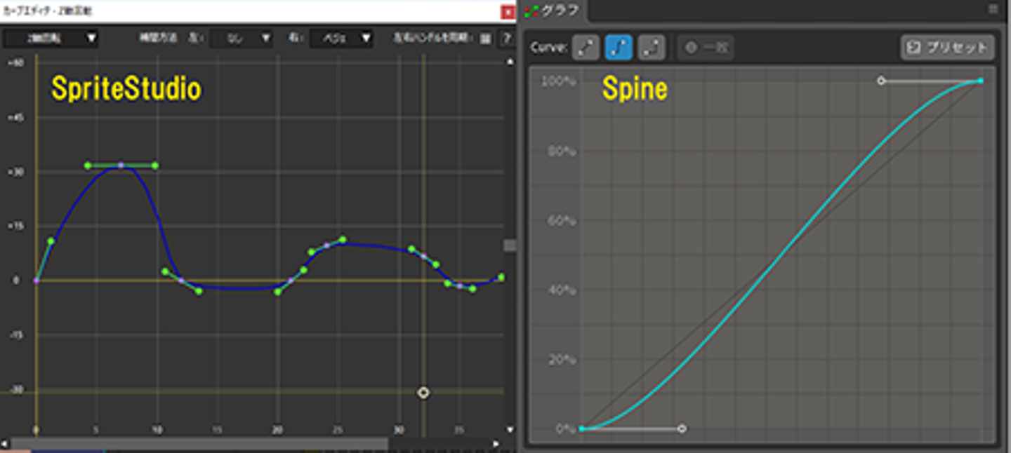 又、上記の項目にはありませんが、カーブエディタ部分でも以下の画像を見て分かるようにSpriteStudioは複数カーブ範囲が表示されるので全体を見渡しながらカーブを編集できるのに対し、Spineはキーとキーの間。インとアウトのハンドルを制御するのみとなっています。カーブ制御も全員一致でSpriteStudioにGoodを出しました。