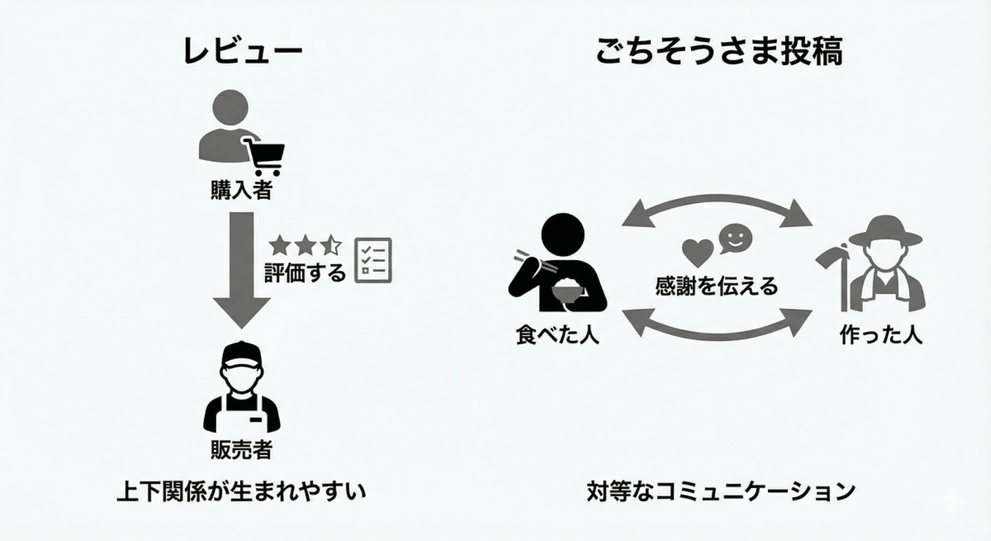 ポケマルにもレビュー機能はあるのですが、ごちそうさま投稿はそれとは明確に区別しています。 目指しているのは、「お客様と販売者」というドライな関係ではなく、「個と個」の対等なつながりだからです。