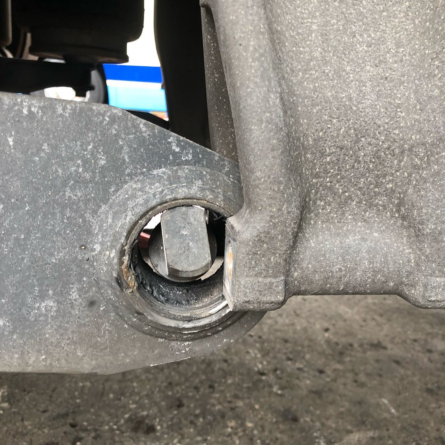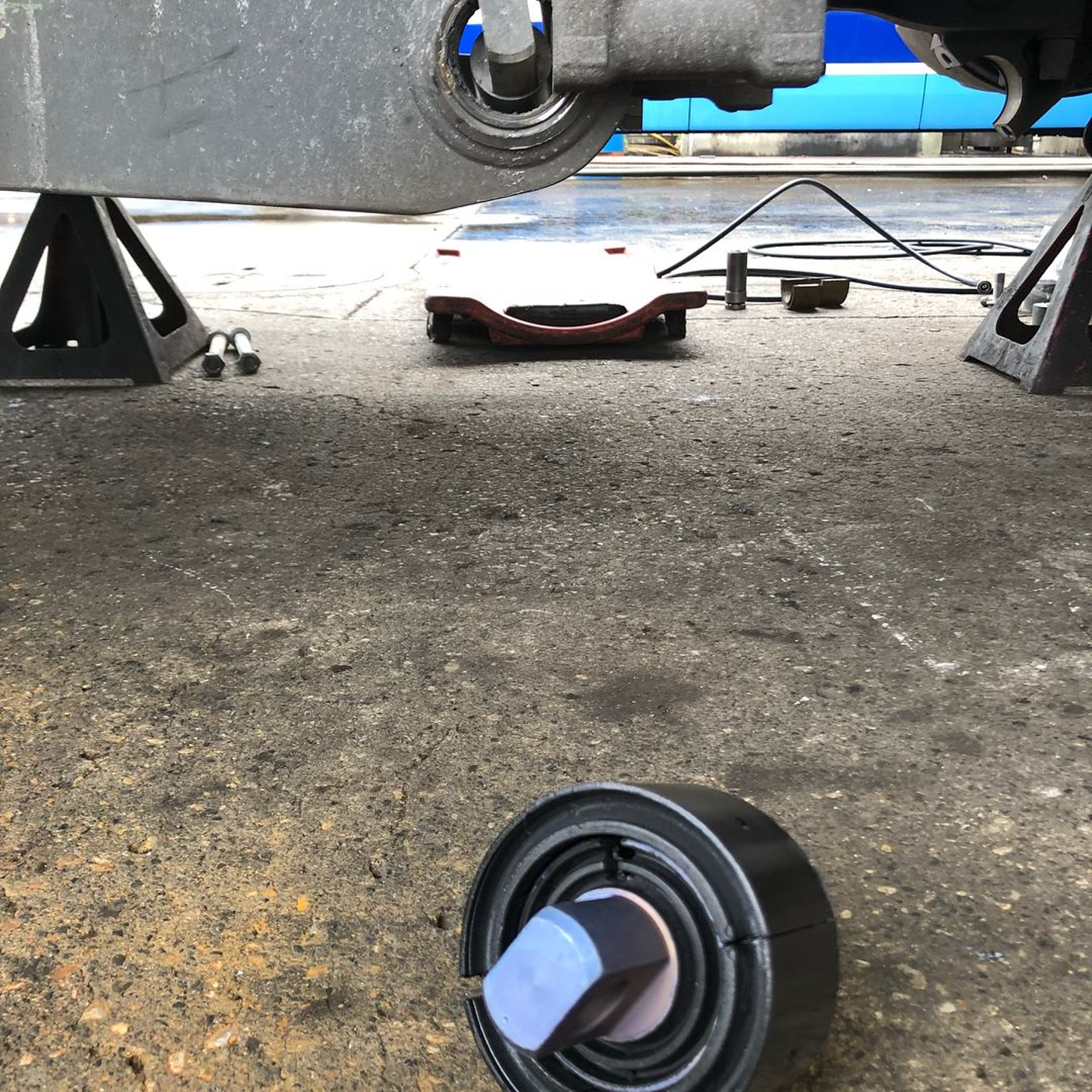 大型トラックのサスペンションに使用されているブッシュという部品か完全に消耗してしまっています。これでかなりの重量を支えていたとは、、本当に危険ですね。
