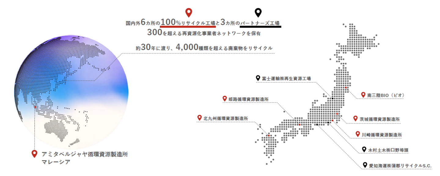 ↑アミタは国内で5か所、海外で1か所のリサイクル工場を保有しています