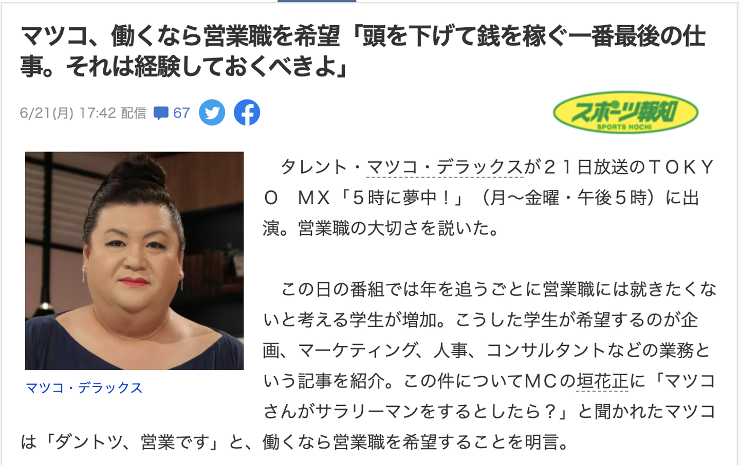 タレント・マツコ・デラックスが21日放送のTOKYO MX「5時に夢中!」(月~金曜・午後5時)に出演。営業職の大切さを説いた。 ...