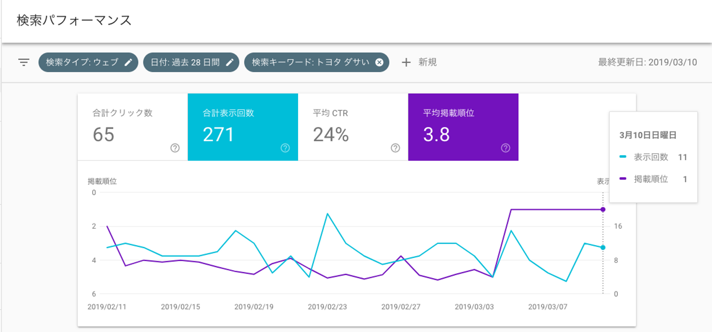 結果、見事に長期的にオーガニック流入を掴み検索1位を勝ち取りました。自分の書いた記事がGoogleで一番上に表示されたときは、とても達成感がありました。さらに、記事の内容はトヨタ車を発表する度に議論されるため、安定してアクセスを見込めます。仮説検証結果がうまくいった気持ち良い例です。