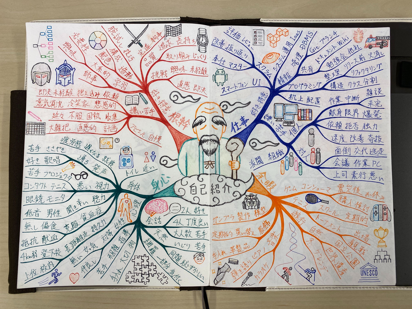 私自身を仙人様に例えられる事が何回かあったので、セントラルイメージには仙人様を描いて、BOIには「根幹」のほか、「心身」、「仕事」、「余暇」を据え、自己紹介のマインドマップを描き上げました。