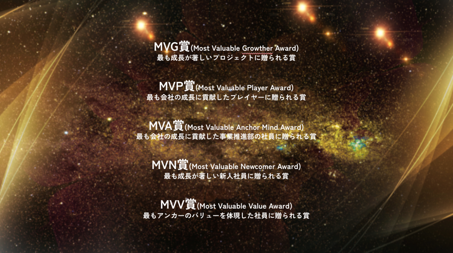 MVV賞 (Most Valuable Value Award) アンカーが大切にするバリュー(価値観)を最も体現した社員に贈られる賞です。周囲への影響力を含め、企業文化の模範となる存在です。