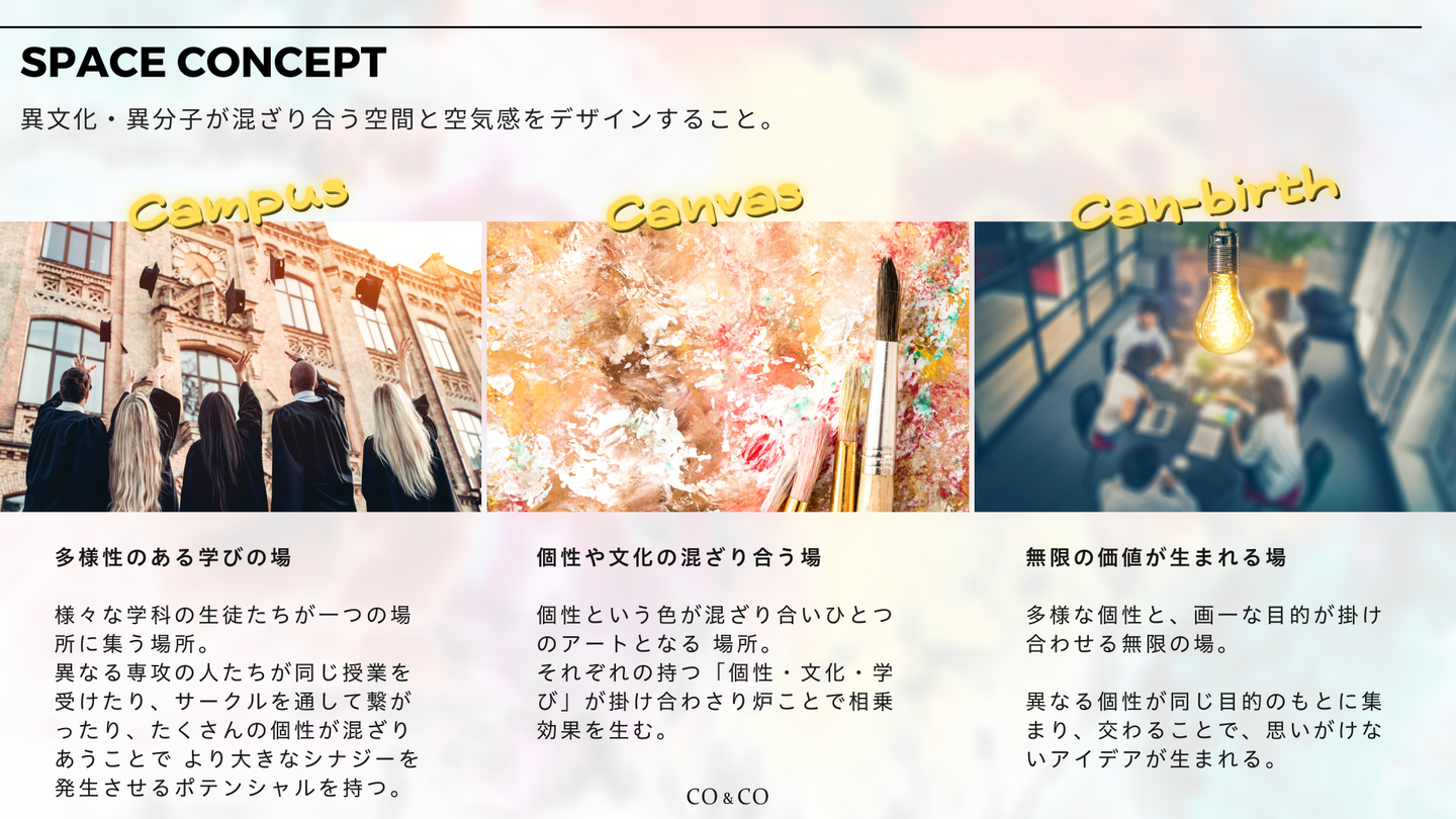 CO&COの課題感として、多民族国家においてでさえ、“異文化共存”は実現できていても“異文化共生”は実現できていないと考えています。同一性を重んじ、同調圧力の強い日本においては尚更です。この画一主義の社会の中で、個性を尖らせて生きていくのは難しい。そこで、国籍、人種、性別、年齢、職業、価値観、バックグラウンドなどがカオスすぎる人々が集う「違うことが当たり前」の空間(環境)を生み出すことで、「自分は自分でいいんだ」と心から思える居場所を創る。