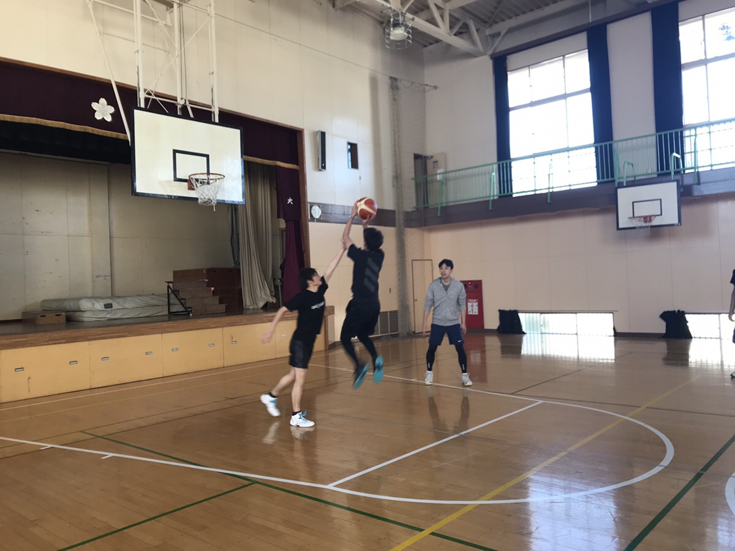ここで亮くんのバッシュの底が壊れてしまい、接着剤を買いに行くというアクシデントが!幸いなことに無事修理ができたので、このあとのお楽しみの3対2をすることができました。