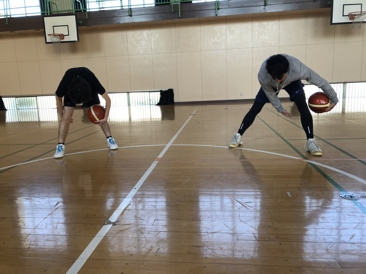 5分間走から始まり、ストレッチをしっかりしていきます。次にボールハンドリング。寒すぎて指がかじかんでいてボールを操るのが難しく、苦戦しました。