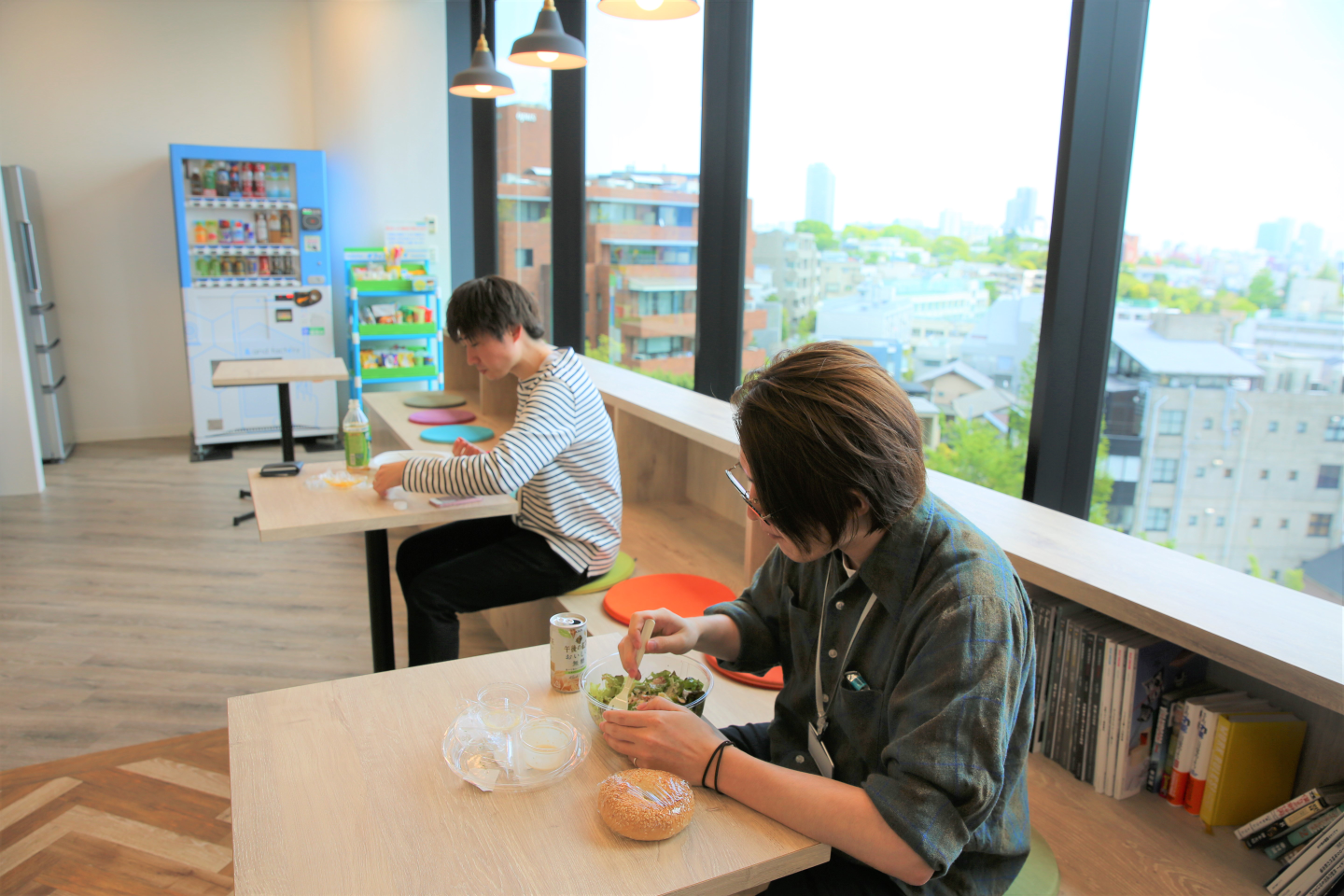 届いたお弁当は2Fの&AND CAFEに届きます。そのままカフェスペースで食べるメンバーが多いです。1Fと2Fにフロアが分かれましたが、メンバー同士のコミュニケーションが毎日ここでもとれます。