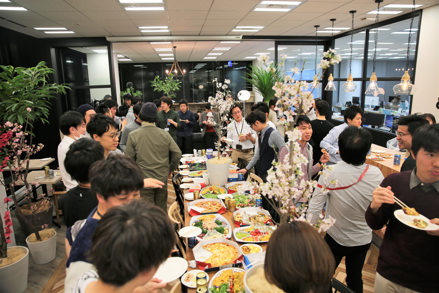 毎週金曜日19時からお酒とご飯が食べられます。ピザやケンタッキー、アジアン料理、パエリア、お寿司…。お酒を飲みながらわいわい楽しみます。社外の方の来社も可能なので、他の会社の方ともコミュニケーションをとることができます。