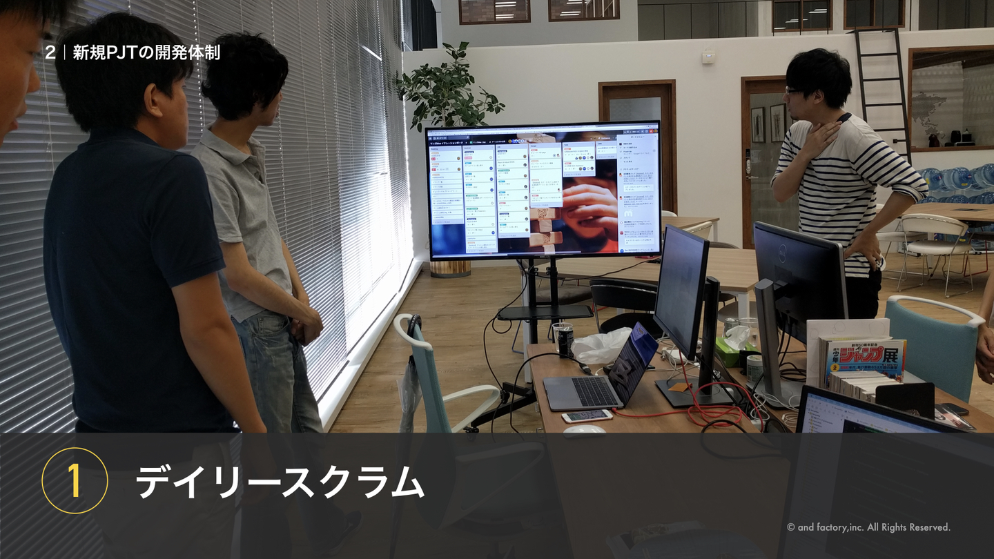 そして効率性を維持するためデイリースクラムとKPTを使ってアジャイルの原則を守りながら、最も効率的に情報を伝えられる「対面でのコミュニケーション」を行っています。
