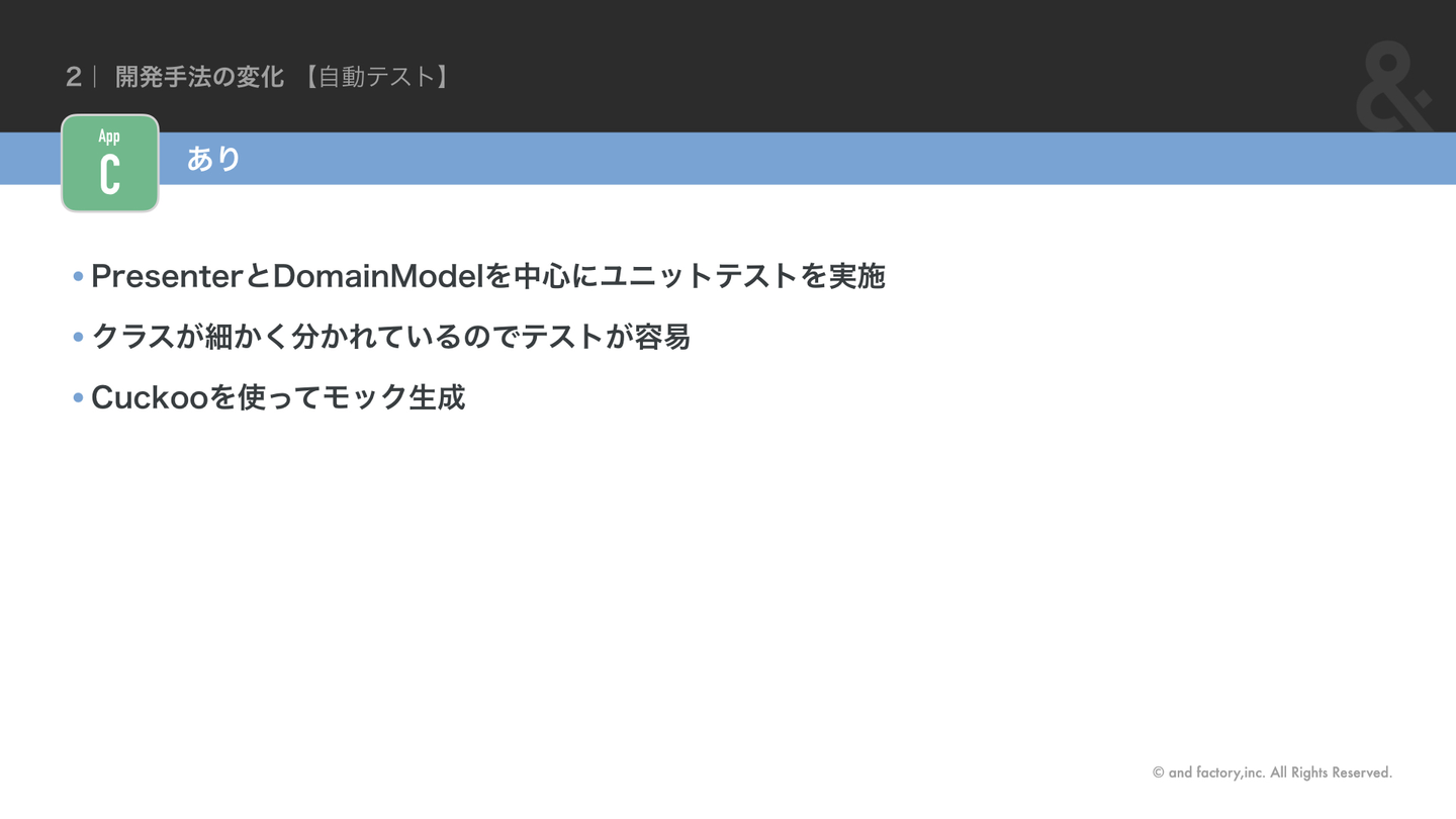Clean Architectureのうち、ロジックを持つPresenterとDomainModelを中心にテストを行っています。依存クラスが多いためにモックも必要となりますが、Cuckooというテスティングフレームワークを使用しています。