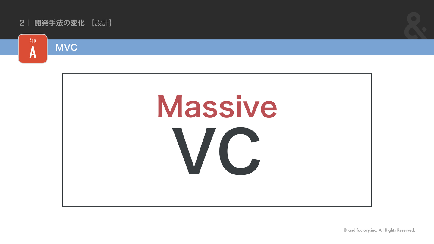 最初のマンガアプリはMVCを用いた開発でした。ただしMは”Massive”のM、つまり巨大なViewControllerが存在するだけでした。この方法では、学習コストをかけずにすばやく開発することができるので、エンジニアとしても組織としても未熟な当時としては適切な方法でした。