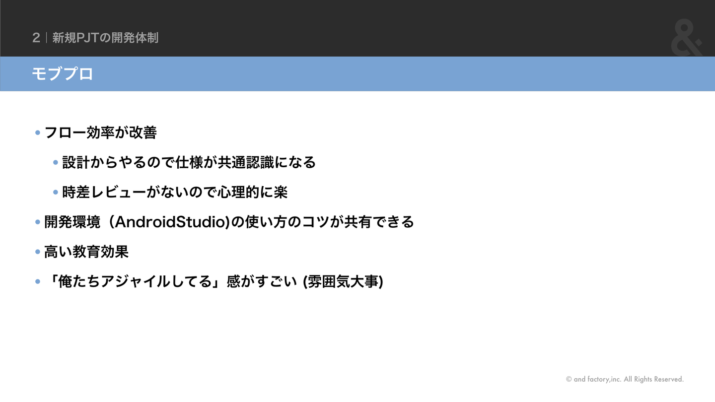 モブプロのことは先の川辺もお話しましたが、心理的に楽であること、チームで作業している雰囲気がとても気に入っています。疑問はその場で解決することで個人で解決するときに起こりがちな実装完了までの紆余曲折をなくすようにしています。