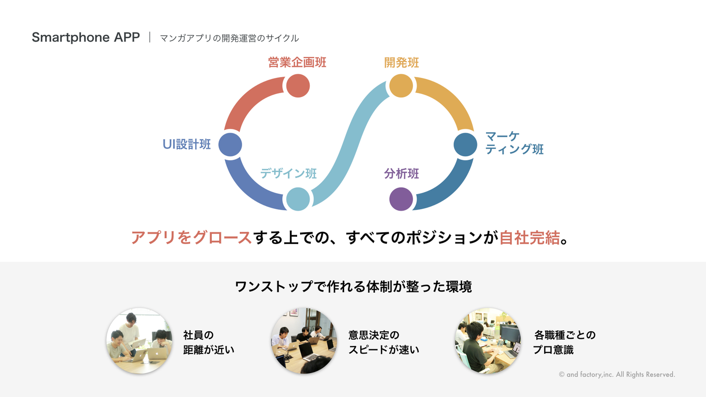 また先日発表した新たなリリースにも触れ、マンガアプリの成長性と関わるプロダクトが増えていることで「マンガアプリといえばand factory」となるような、点から面での拡大を目指しているといった戦略の部分にも触れています。そしてこの早い成長スピードを実現する要因として「コンパクトで距離の近いチーム」、「非常に大きい個の裁量」、そして「意思決定の速さ」の3つを挙げました。
