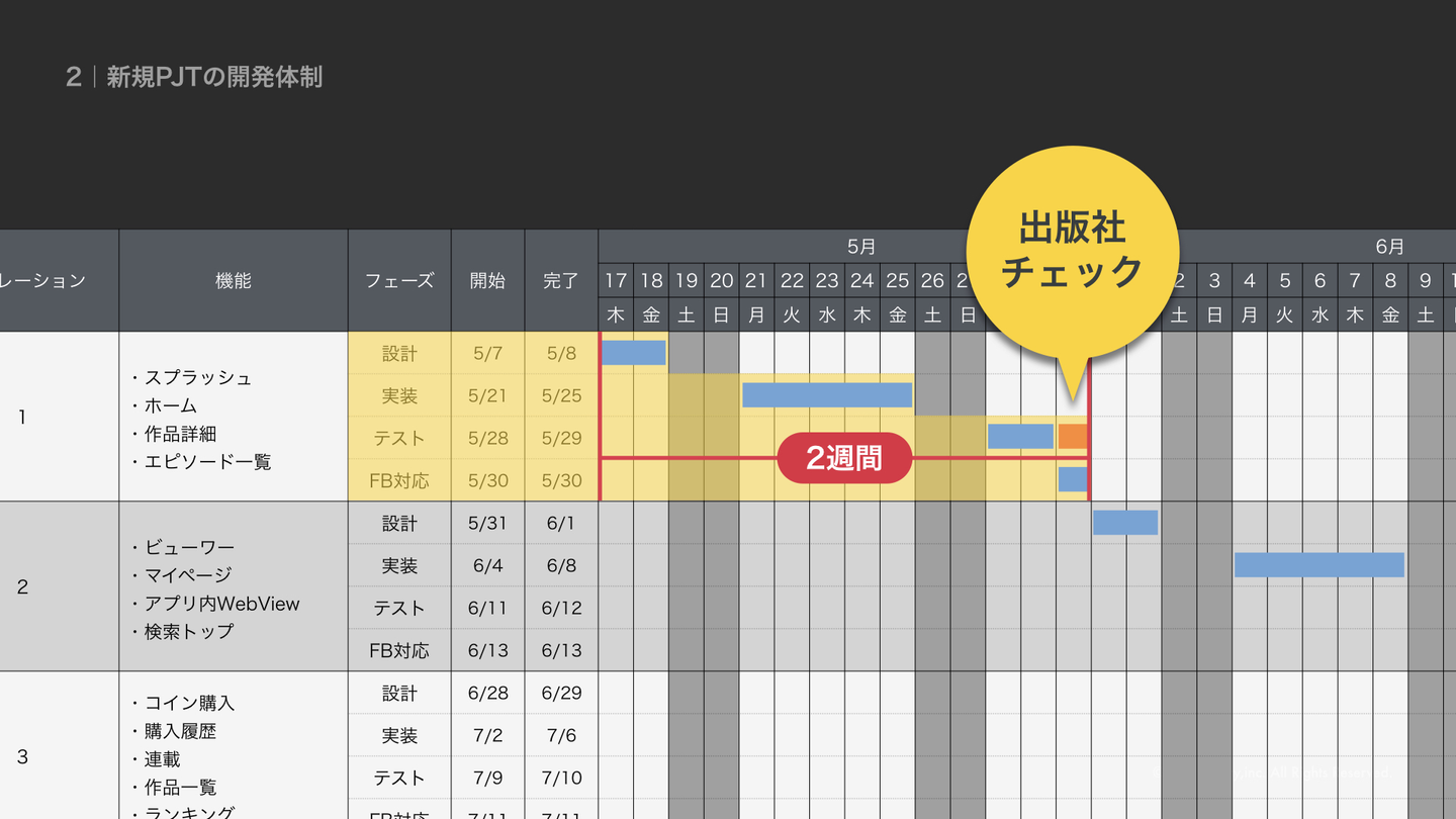 この二つを通じて、協業先(顧客)である出版社様とプロダクトに参加出来るスケジュールを組みます。