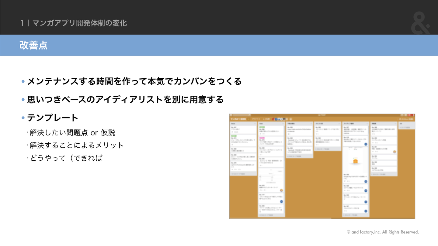 また、チームの結束が強くなったことは非常に意味があります。特にビジネスサイドにも課題や進捗を共有できるようになったので、開発上のタスク消化率をあげる必要性も伝わりやすくなりました。