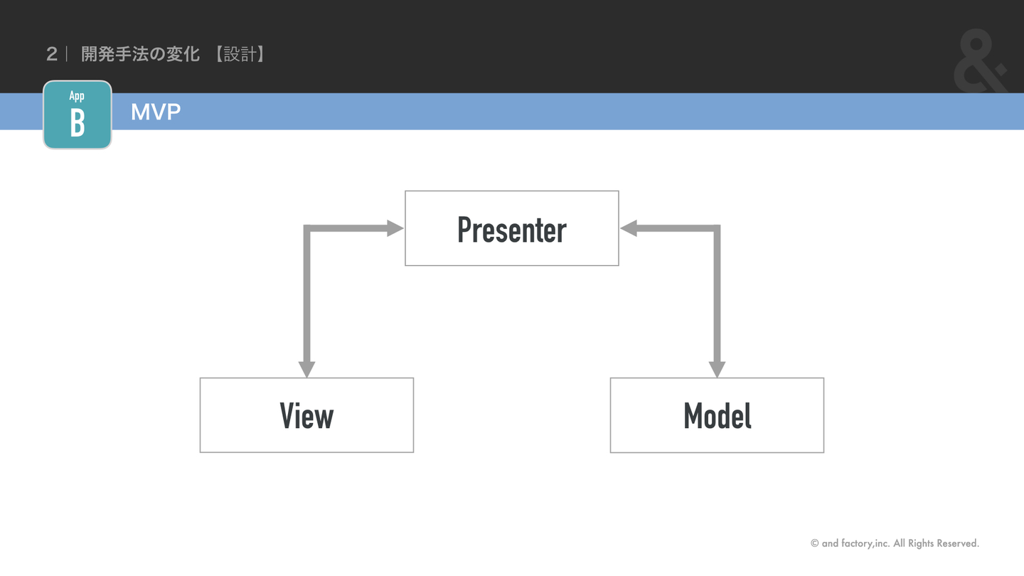 そこで2番目のアプリではMVPを導入し、巨大なVCとなっていたものを3つの役割に分割しました。
