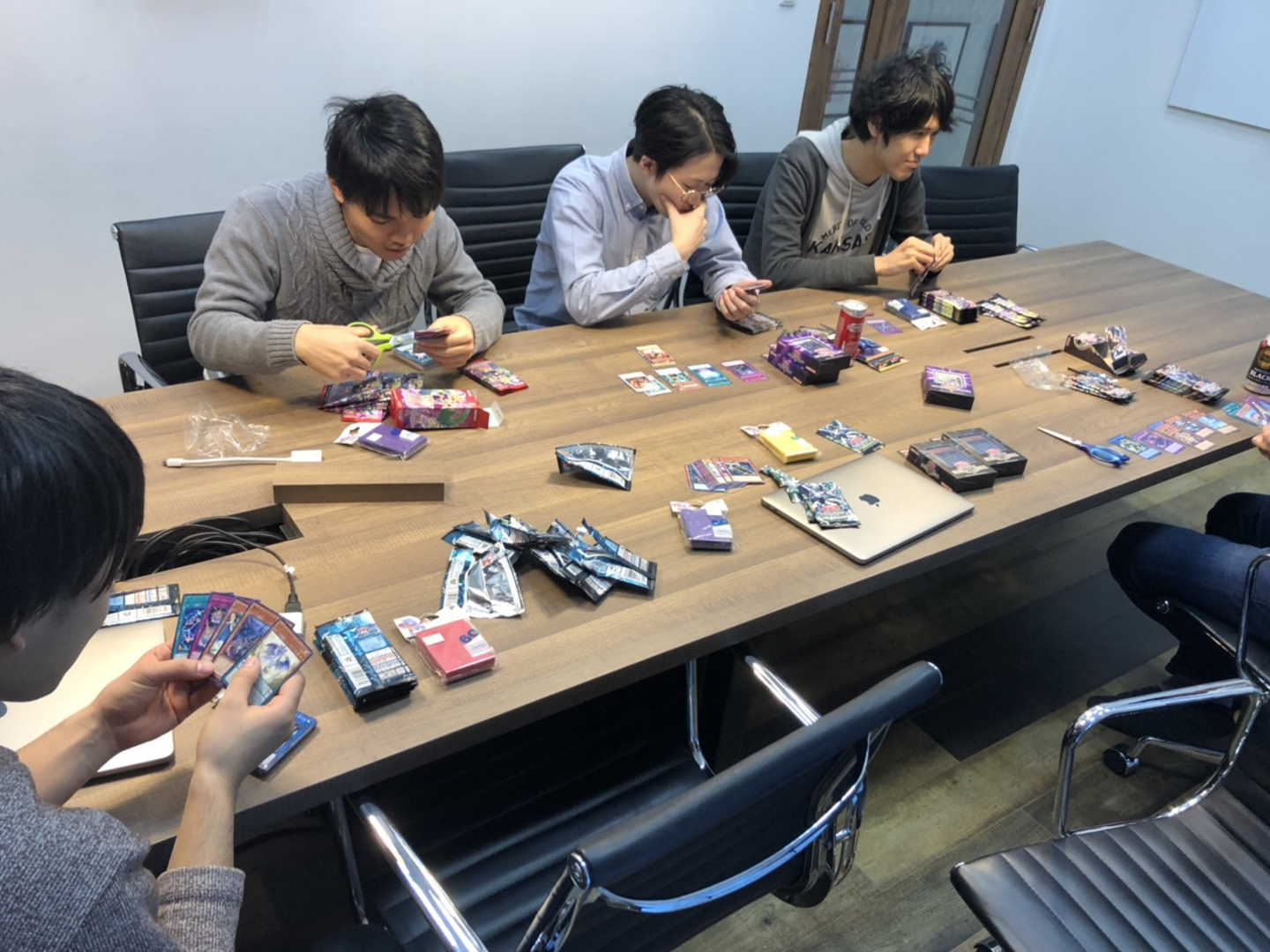 まずは、遊戯王OCG(遊☆戯☆王オフィシャルカードゲーム デュエルモンスターズ)をやることにしたのですが、カードを持っていないメンバーがほとんどということで、メンバーで買いに行ってきました!