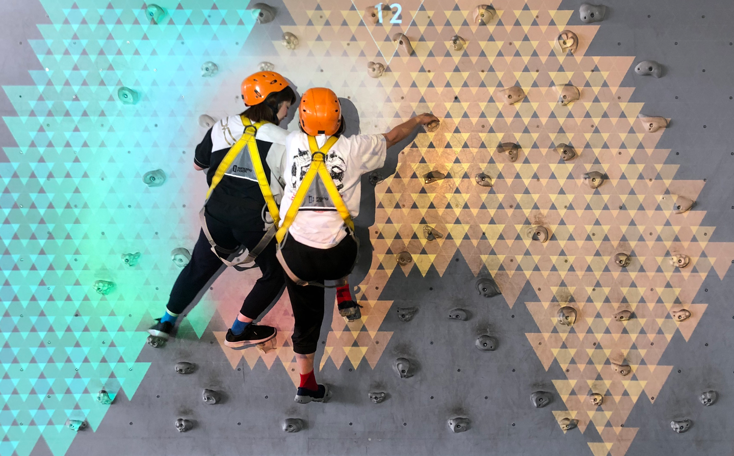 「 クライミングウォールにプロジェクションマッピングとセンサーを組み合わせて、既存のクライミングにはない新しい楽しみ方を体験できる新感覚のデジタルクライミング「WONDER WALL」。 「WONDER WALL」は2017年度グッドデザイン賞、第22回WebbyAwardsを獲得した国際的にも評価の高いコンテンツです。」