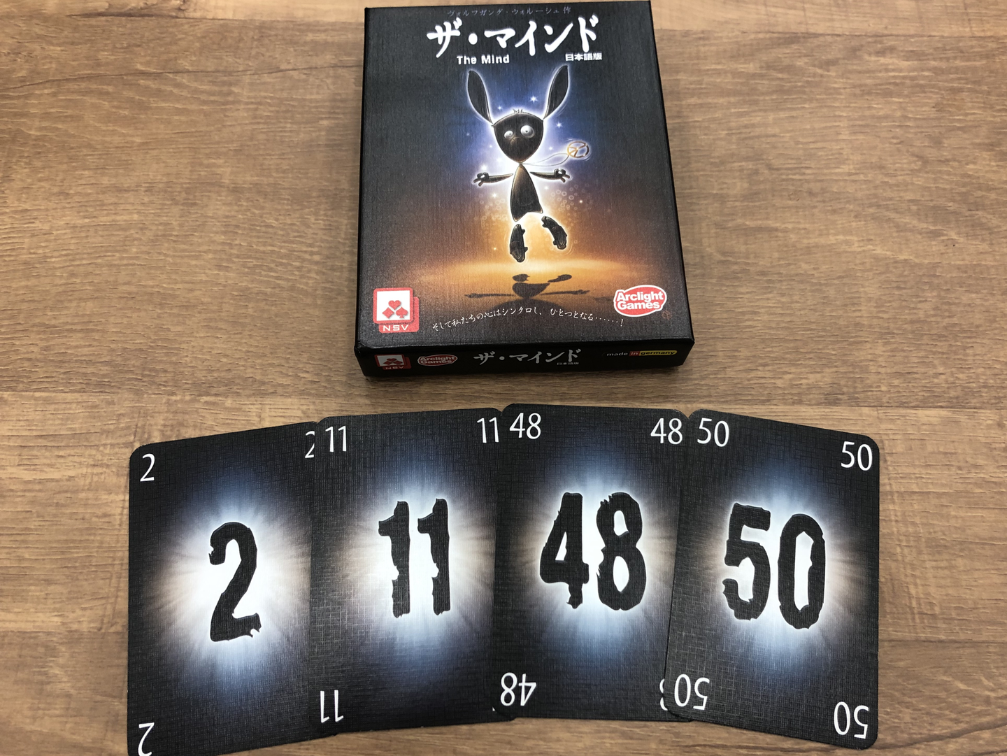 ※参加者が4人で上の写真のカードが配られた場合、2→11→48→50の順にカードを出すことができればクリアです。