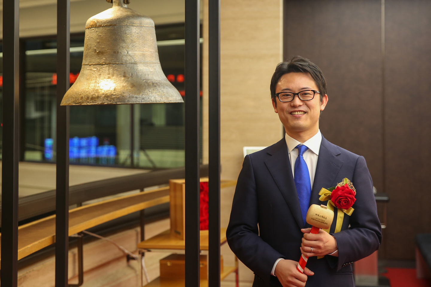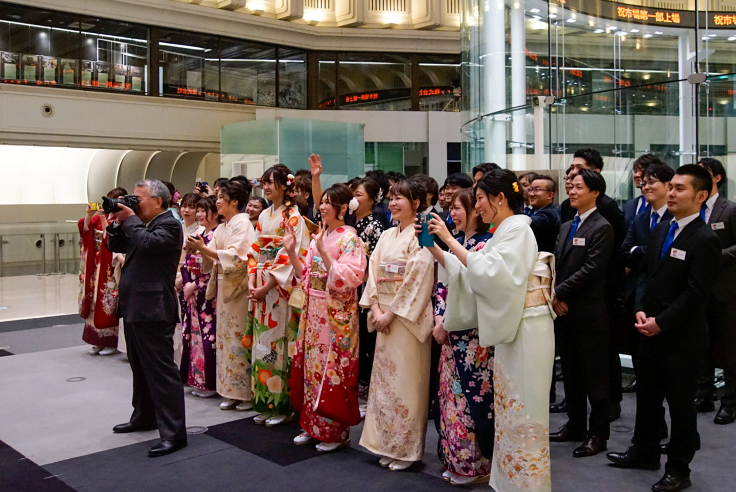 and factory社員に市場変更日を伝えられるのは1週間前だったので、バタバタでネクタイと着付けスタジオを予約しセレモニーへ望みました。(ホッ