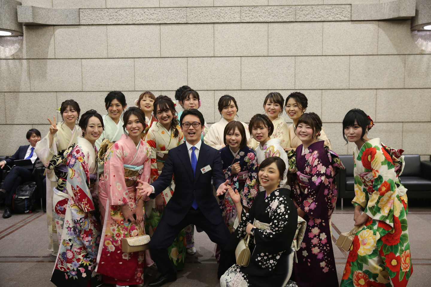 男性はコーポレートカラーの青いタイ、女性は着付けスタジオへ。