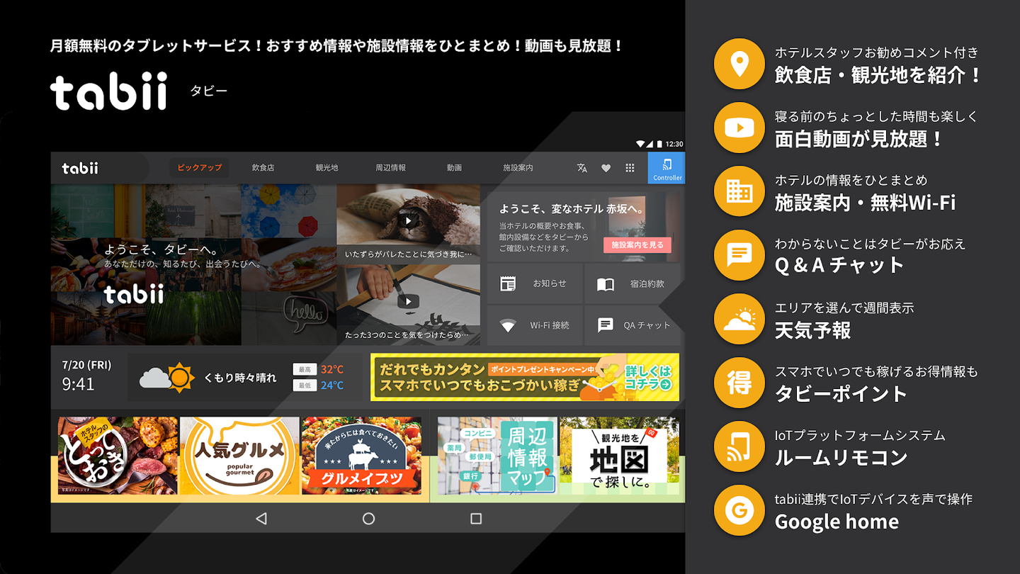 「tabii(タビー)」は月額無料で利用できる宿泊施設向け客室タブレットサービスです。ゲストは館内案内やホテル周辺の観光やグルメなど各々のニーズに応じた情報を得ることができるほか、エンタメ動画を楽しむことができ、滞在中の満足度を高められます。施設に関するゲストからよくある質問をQ&Aに集約することや、情報を多言語対応にすることにより、スタッフの業務軽減にも繋がっています。