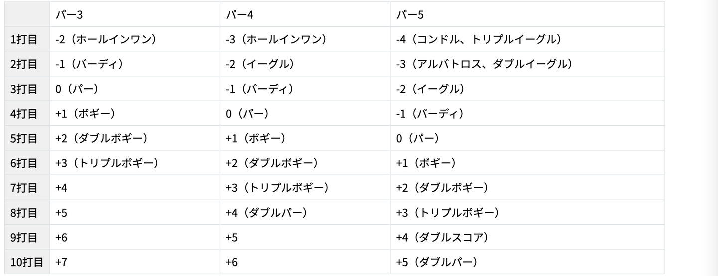 (例)基準打数3打のパー3でホールアウトする場合が以下の表の一番左です。