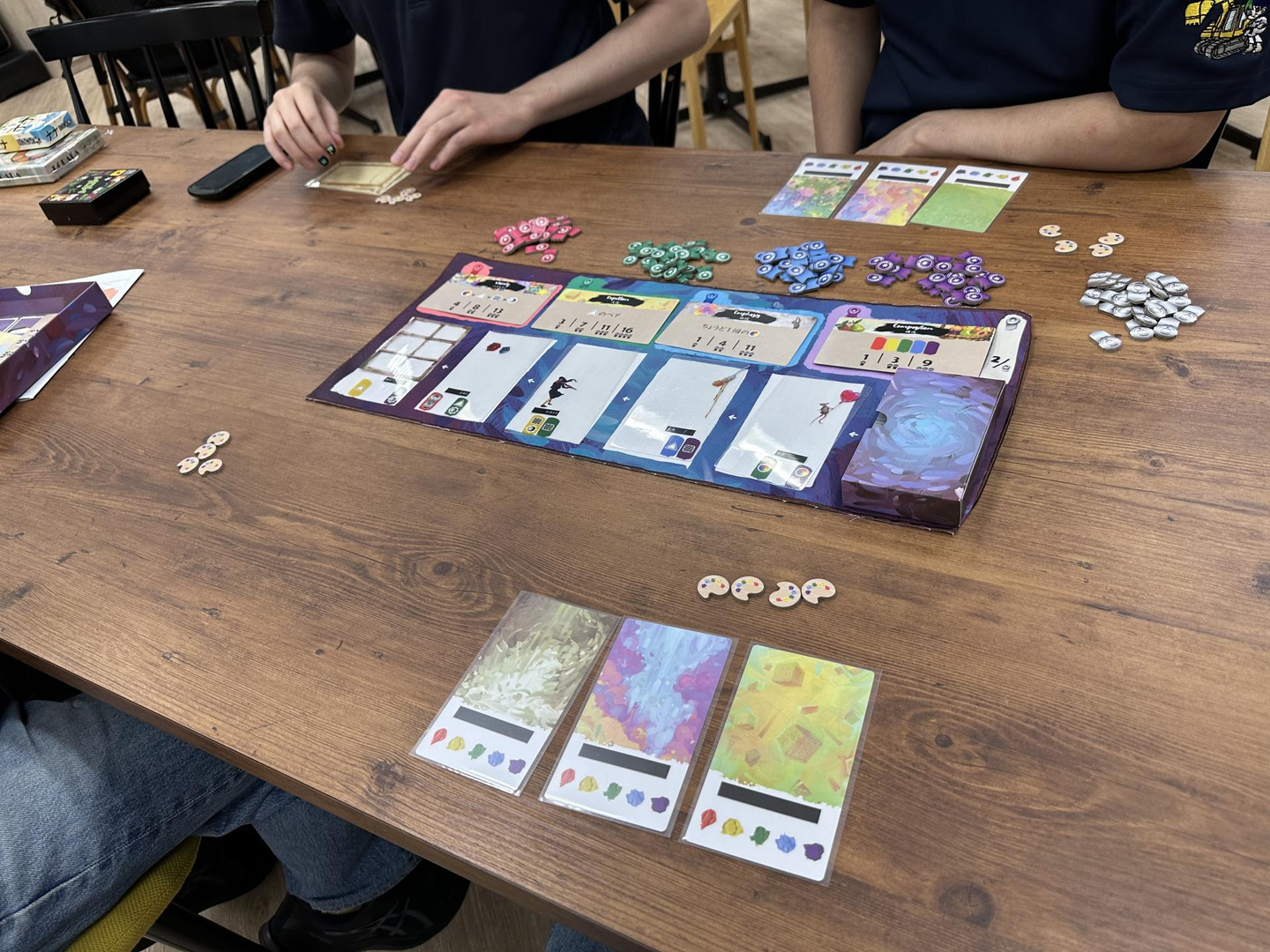 最終的に各自が三点の絵を完成させ、ポイントを競い合いました。ゲームなので点数による勝者は出ますが、このゲームは各自が完成させてその絵を楽しむことができるというのも良いポイントですね。もし仮に同点になってしまったら絵画として美しい方を皆で選んで勝者とするというユニークなルールもあるようです。