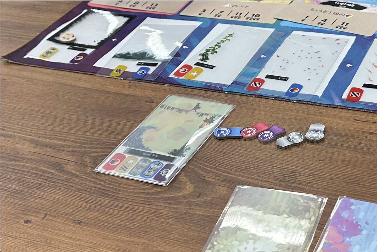 実際に絵が一点完成したところです。いろいろな条件を達成するために、どのカードを組み合わせれば良いかが悩ましいです。ああ、そのカードが欲しかったという嘆きもありつつ、各々がカードを集めて絵を完成させていきます。