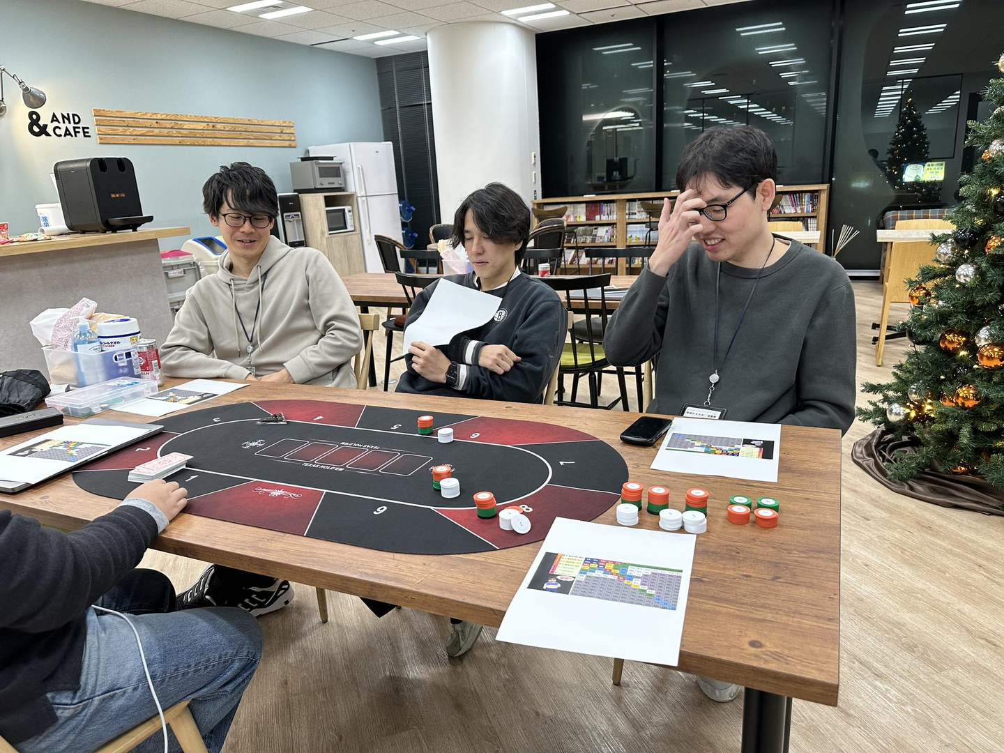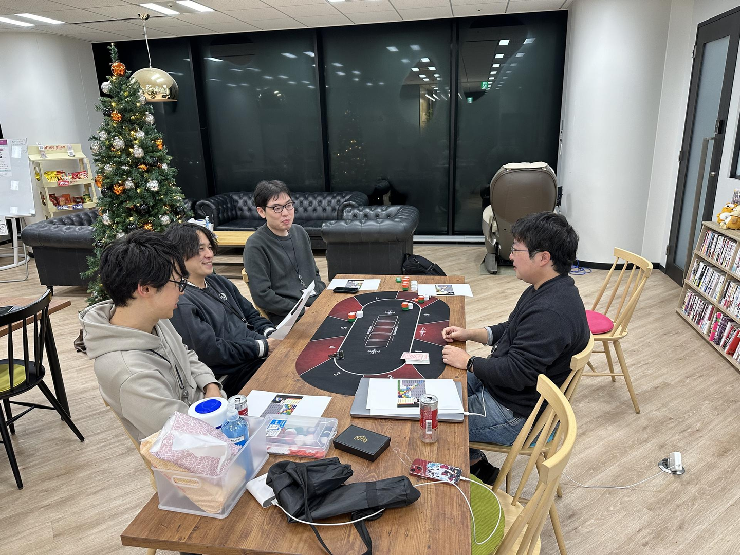後ろにクリスマスツリーもあり、非常に和やかなように見えますが五人のうち二人が破産するという波乱の展開でした。何度もプレーを行い二時間があっという間に過ぎるような濃密な時間を過ごすことができました。