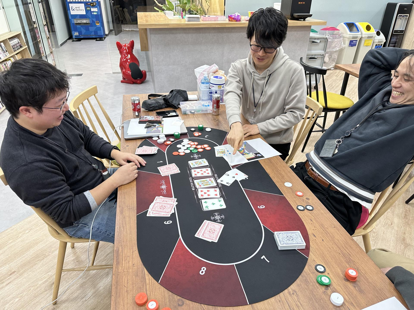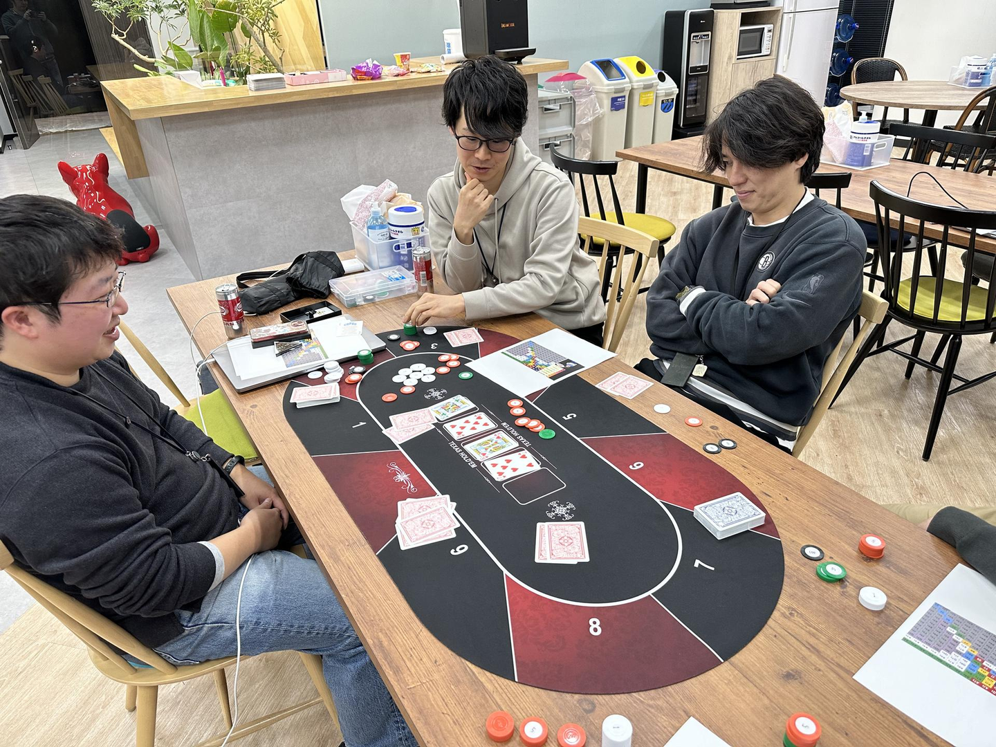 今月はポーカーをプレイしました。ポーカーといっても様々な種類があるのですがその中で世界的にメジャーであるテキサスホールデムを遊びます。メンバーの一人がチップ、シート、ポーカー用のトランプを用意してくれたためしっかりと遊ぶことができました。