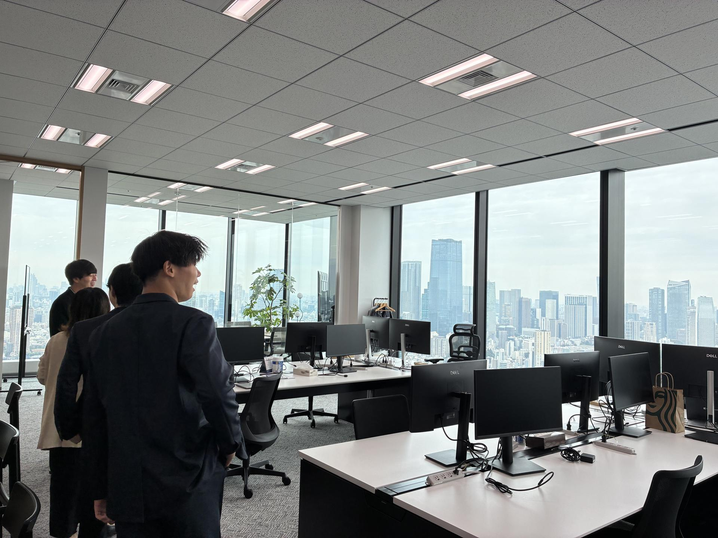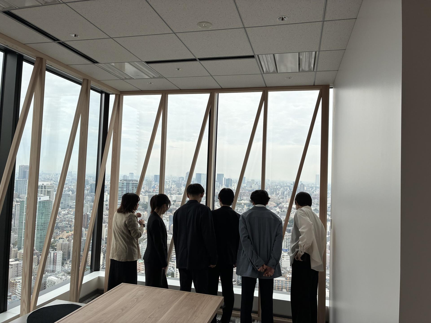 内定式の前に内定者にとって、移転後初のオフィスツアーを実施。ガラス張りの執務室と37階からの眺めに内定者達は興味津々でした。
