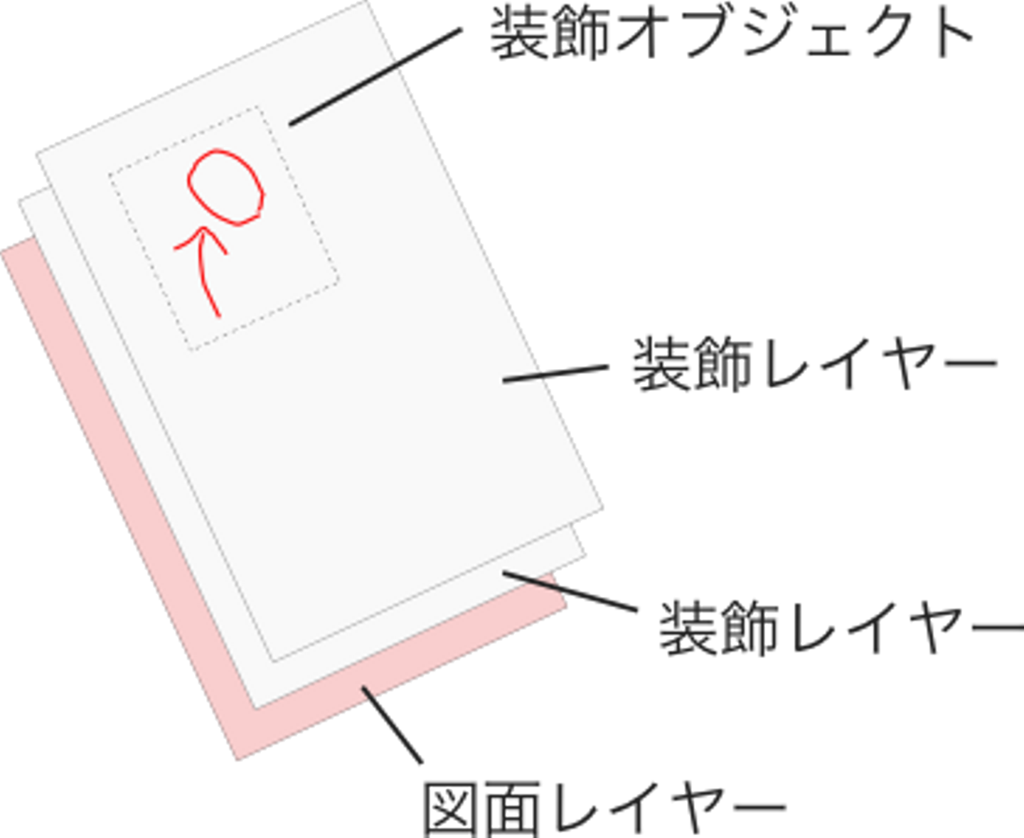 図面アプリの機能を簡単に言うと、PDF資料に保存された図面の各ページを複数人で共有しながら手書きで書き込んだり、写真付きのピンを設定できたりするアプリです。図面アプリでは、レイヤー構造を持った画面が構成されています。一番下には図面を表示する図面レイヤーが置かれ、その上にテキスト、ピン、手書きなどのオブジェクトが置かれる構造になっています。説明上このオブジェクトを装飾オブジェクトと呼び、それを配置するレイヤーを装飾レイヤーと呼びます。